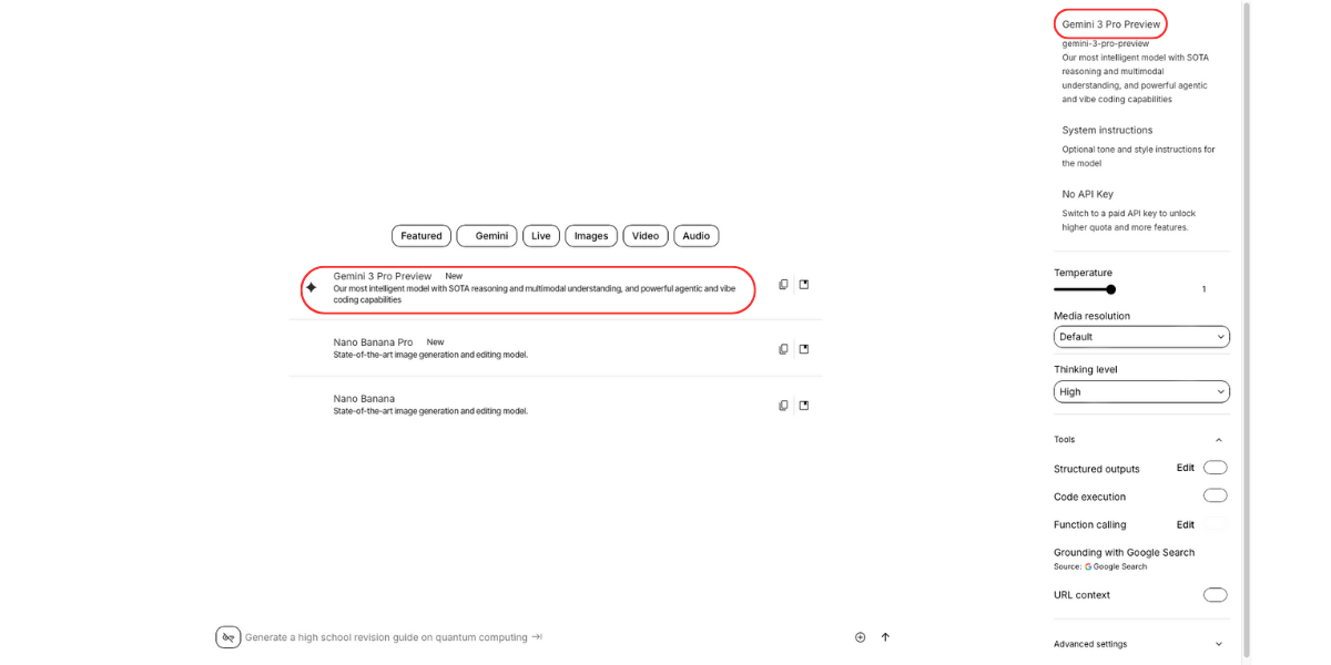 開発環境であるGoogle AI Studioでは、Gemini 3 Proを含む最新モデルを無料で試用可能です。