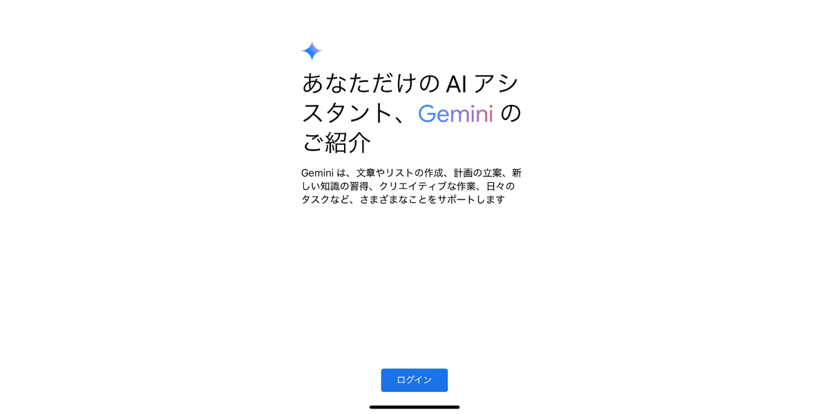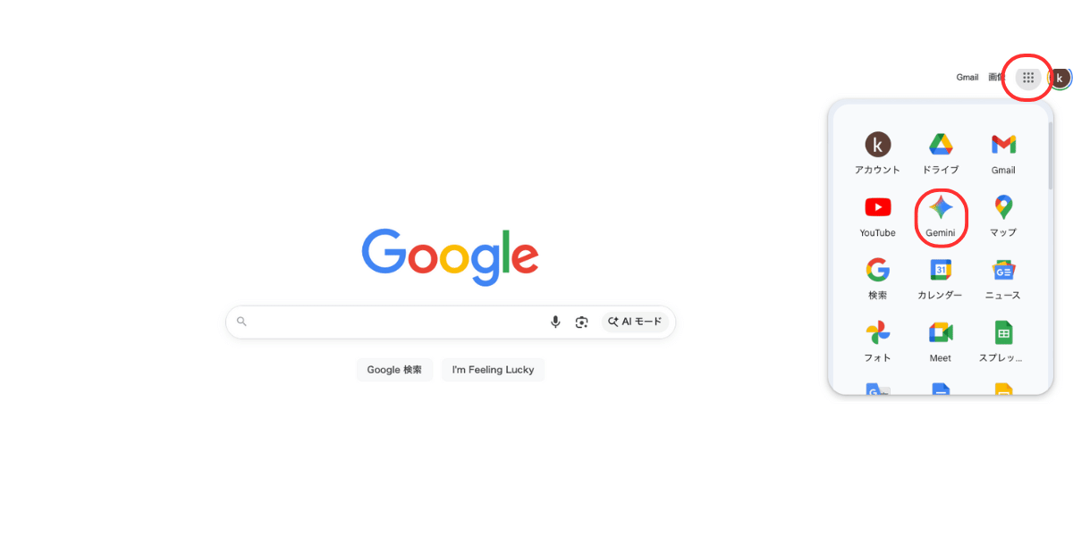 GoogleのTOP画面からGeminiを開き、Googleアカウントでログインします。