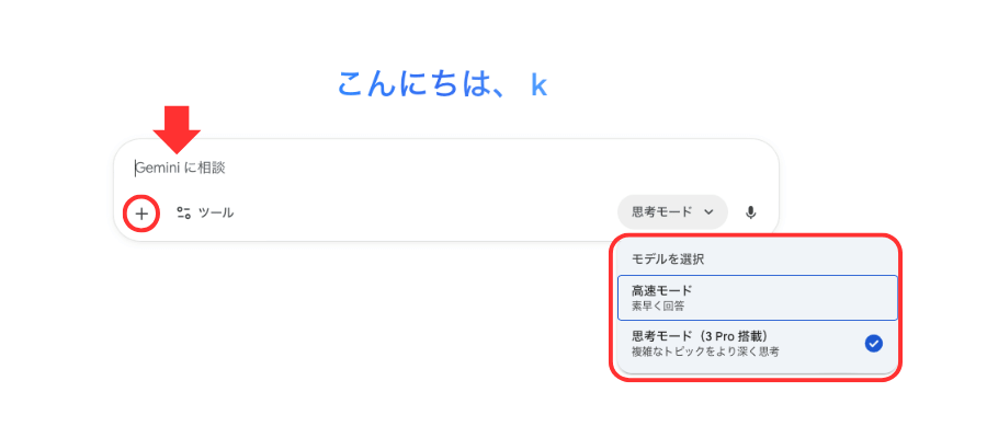 チャット欄のタブから「思考モード(Thinking with 3 pro)」を選択可能です。