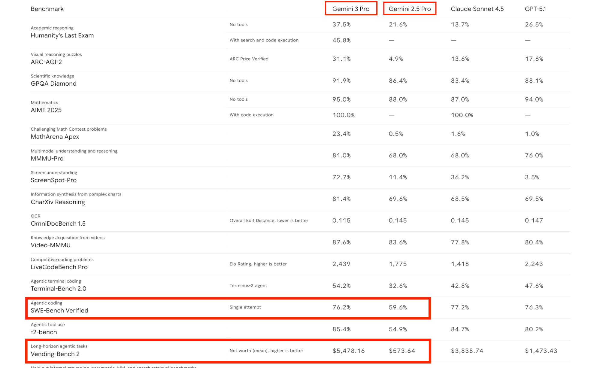 Googleの公式ブログでも、Gemini 3 Proの進化についてGemini 2.5 Proを大幅に上回ると明言しています。