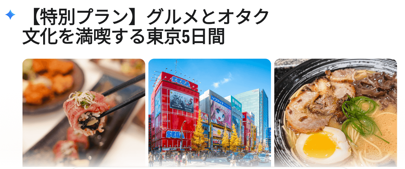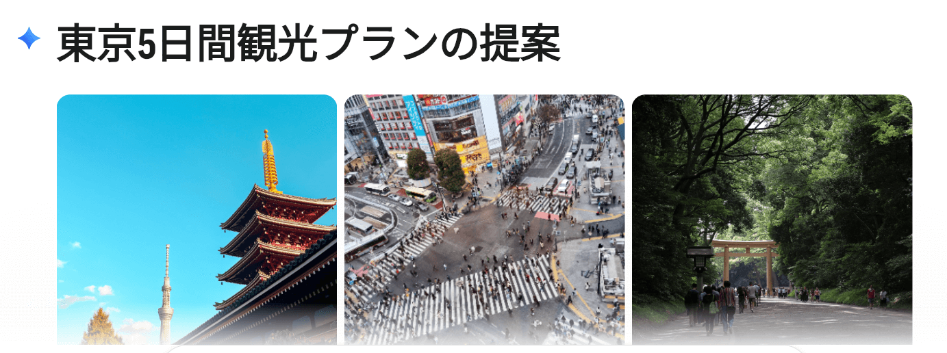 以下は、ブラウザ版のGeminiにて、「東京旅行の計画を立てて」と依頼した際のスクリーンショットです。