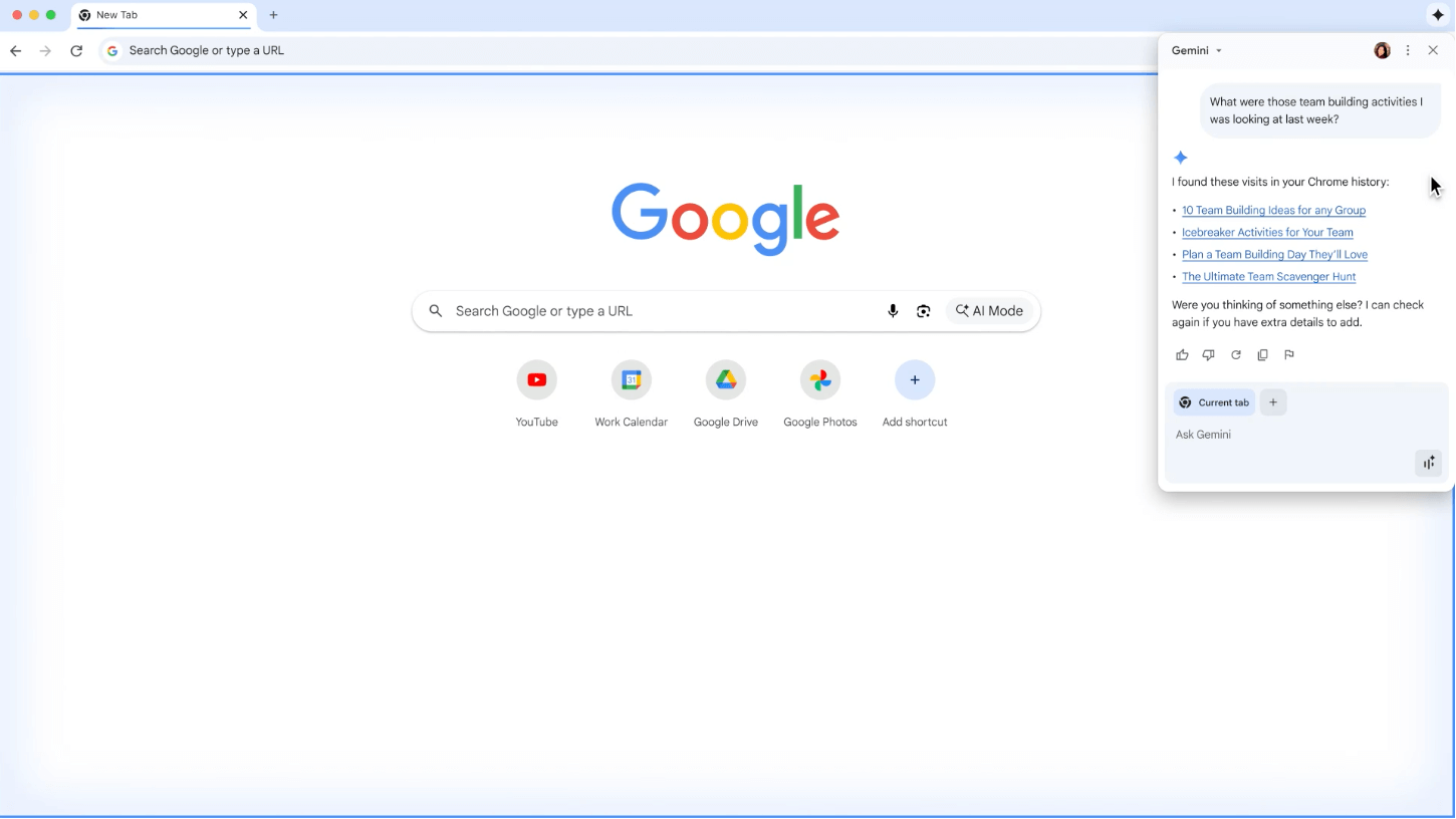 例えば、「先週見たウォールナット材の机のサイトは?」や「新学期の買い物で参考にしたブログは?」と質問すればGeminiが関連する閲覧履歴を特定します。