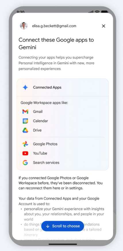 Personal Intelligence is a new beta experience that connects Gemini to information from your Google apps, like Gmail, Photos, and Search. You’re always in control, and you can turn it off at any time. (Google official blog, Personal Intelligence)
