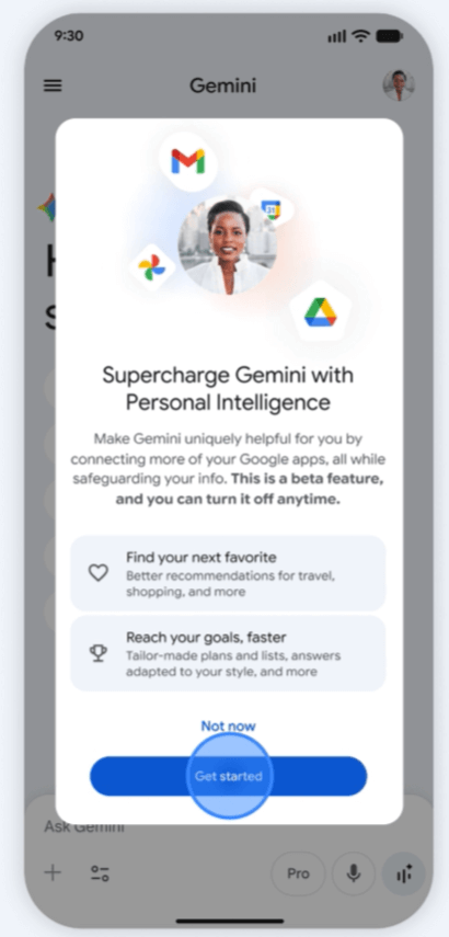 「Supercharge Gemini with Personal Intelligence」というポップアップが表示されます。これはベータ版機能であり、いつでもオフにできることが明記されています。