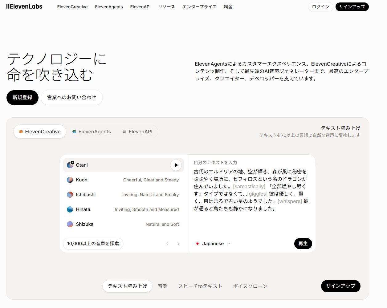 | 音声生成AI | ElevenLabs | スターター:$5 クリエイター:$22 プロ:$99 | 高品質音声合成、声の再現 | ||
