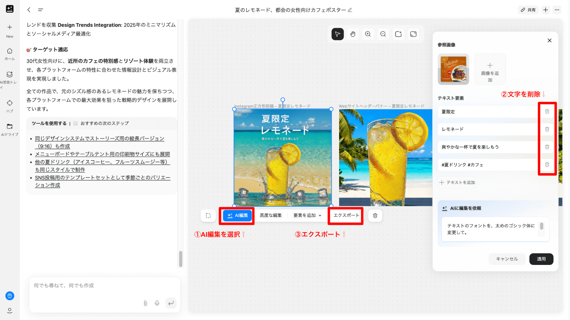 「AI編集」からテキストを削除してから「エクスポート」で画像をダウンロードします。ダウンロードした画像をCanvaやAdobe Expressにアップロードし、正しい日本語や好みのフォント、サイズで文字を編集します。