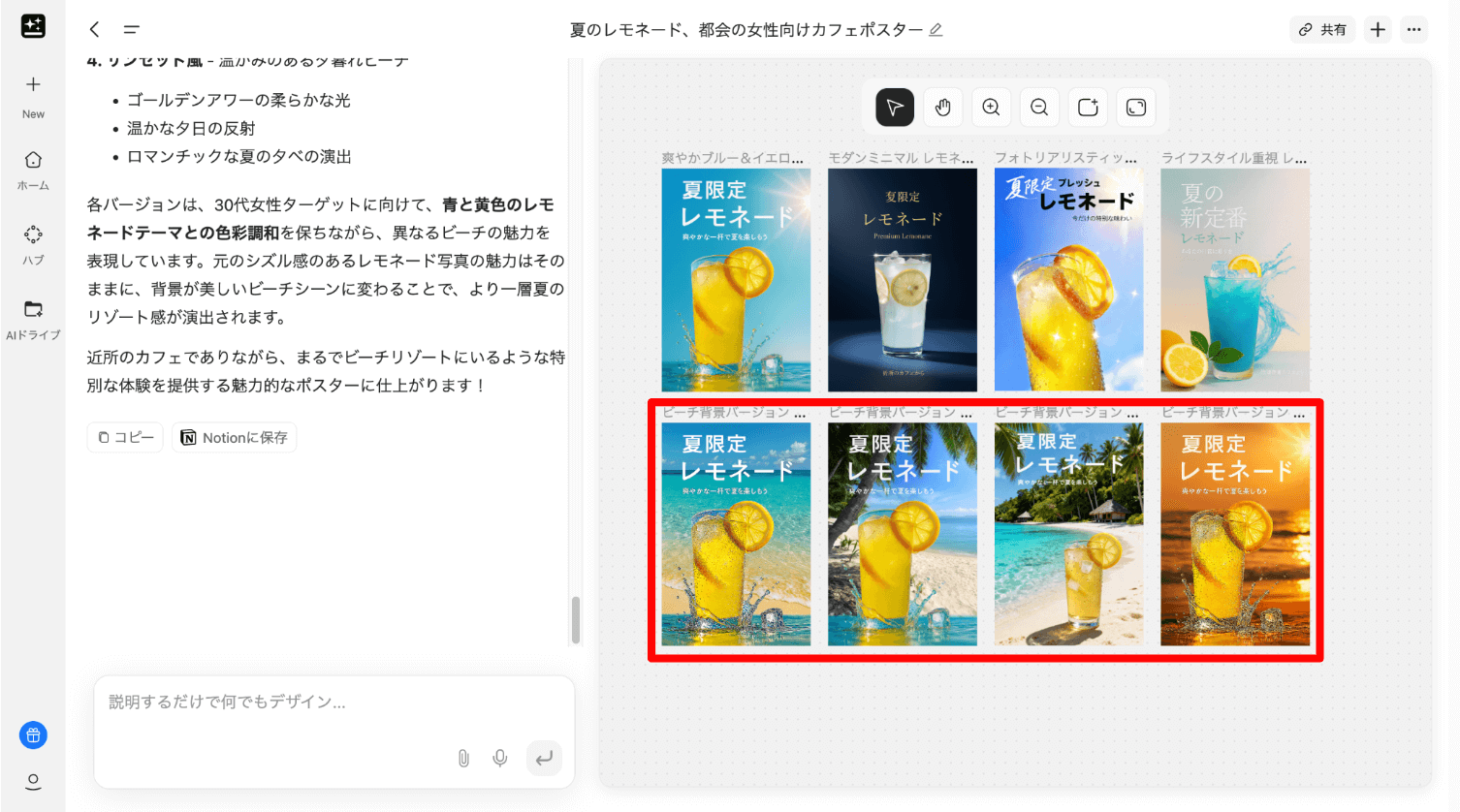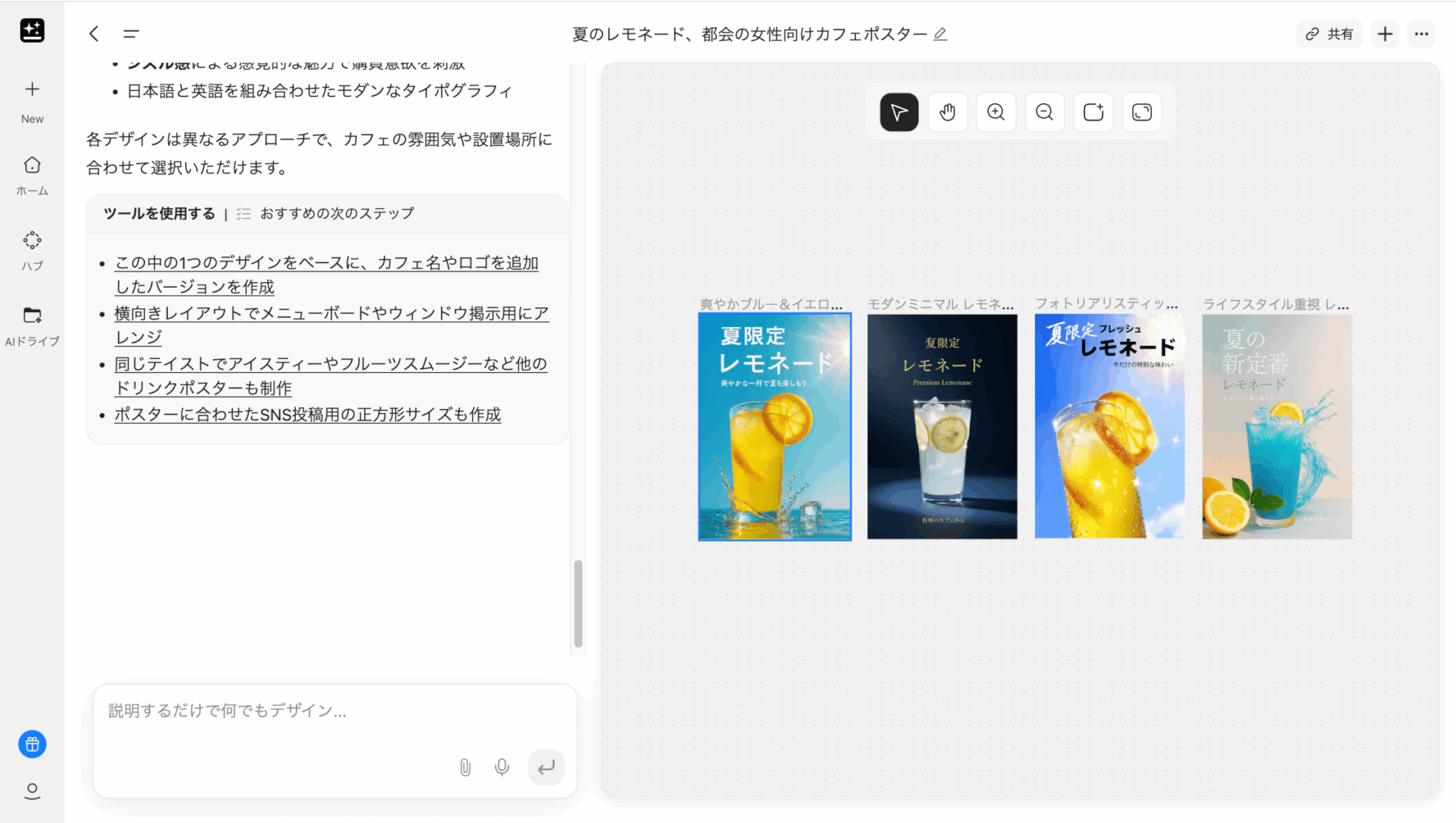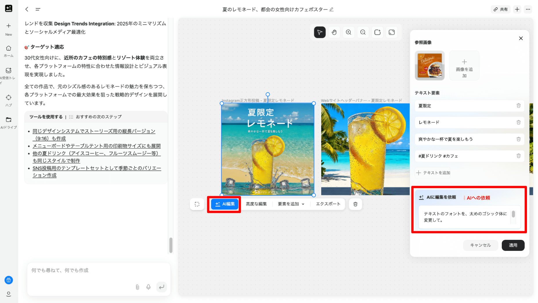 ユーザーが「カフェのサマーセール用ポスター」と指示すると、コピーライティングからデザイン、レイアウトまでAIが一気通貫に対応し、最適なデザイン案を生み出します。
