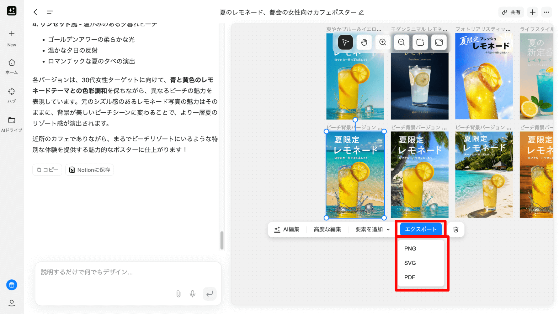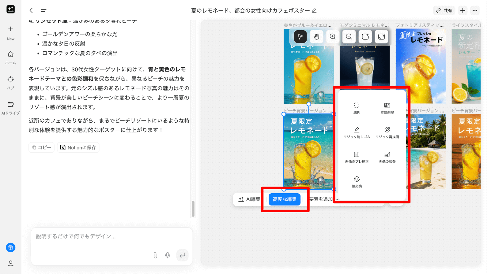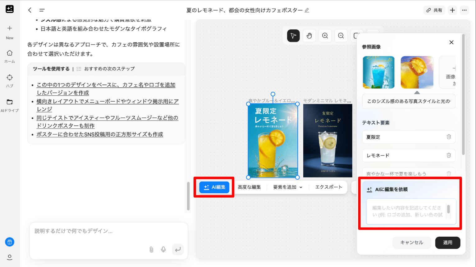 ユーザーが「カフェのサマーセール用ポスター」と指示すると、コピーライティングからデザイン、レイアウトまでAIが一気通貫に対応し、最適なデザイン案を生み出します。