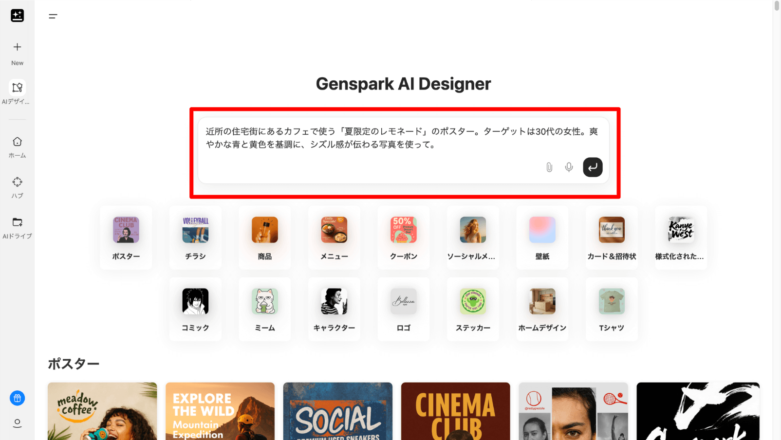 ここからが、Genspark AIデザイナーの使い方の核となる最初の実作業ステップです。