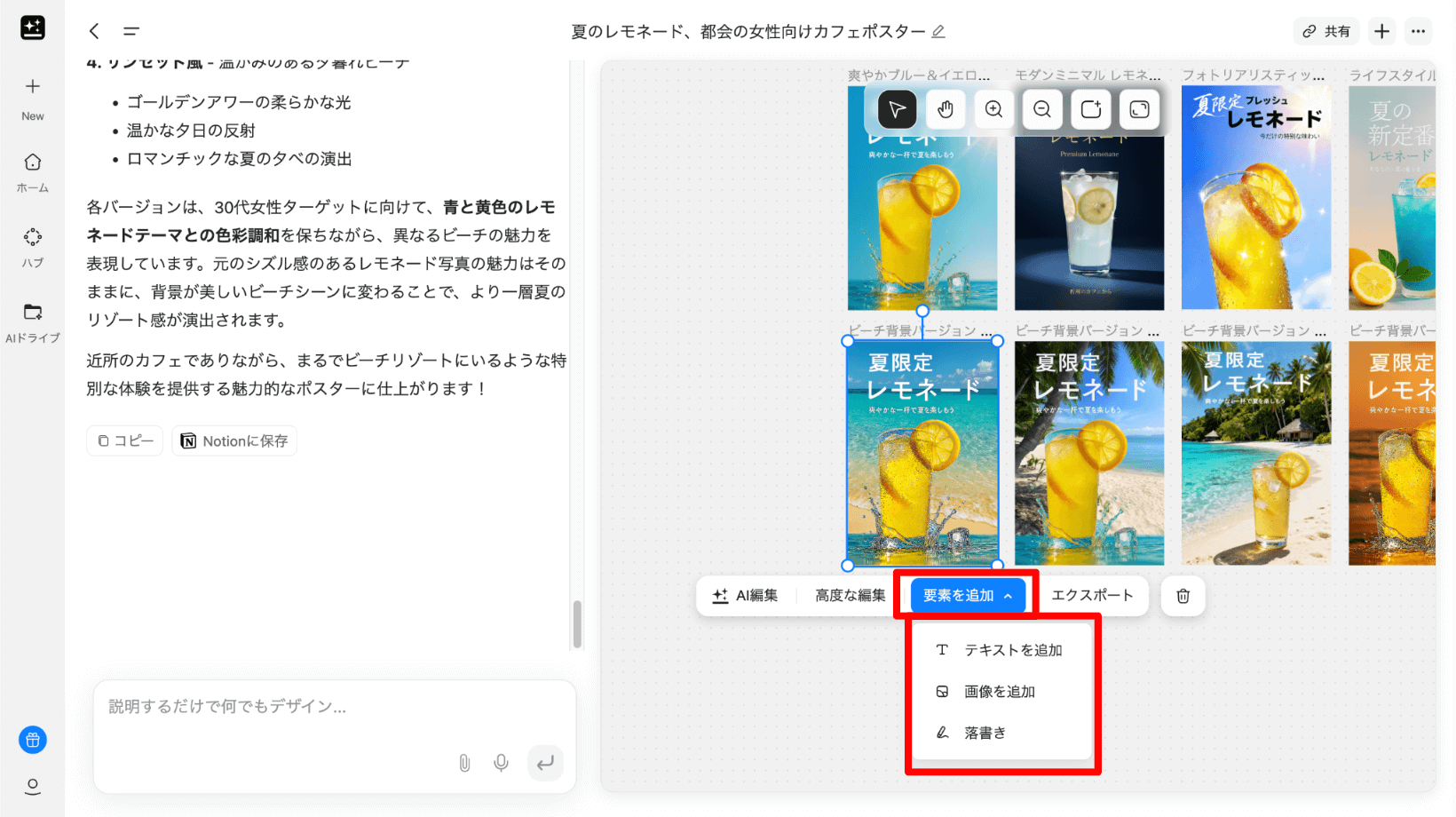 AIが生成したデザインに簡単に要素を追加することもできます。Canvaのように細かく編集はできないので注意が必要です。