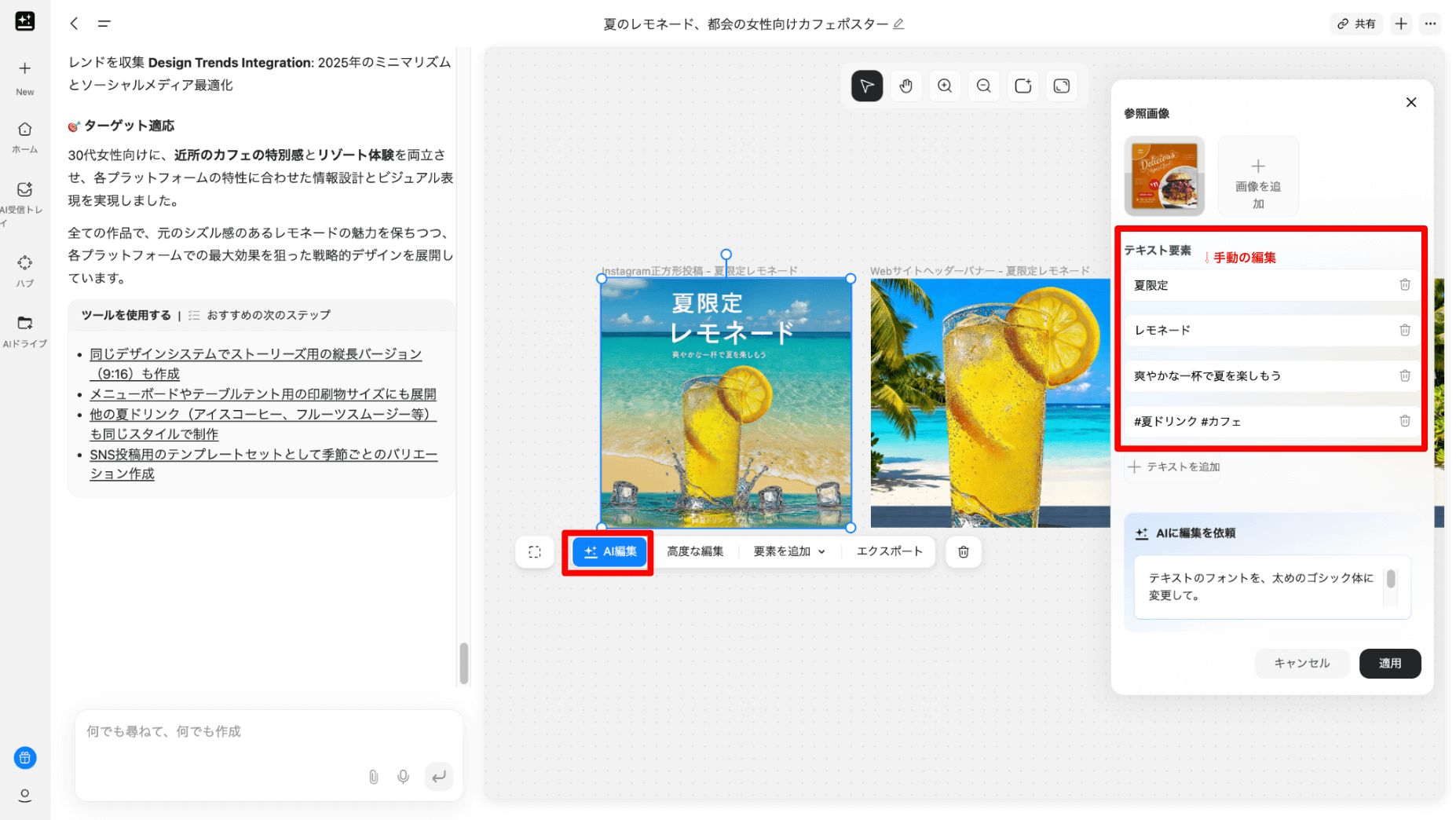 フォントや文字の色に違和感がある場合には、AIに修正を依頼します。編集したい画像にカーソルを合わせ、「AI編集」をクリックすると、プロンプト入力画面が表示されるので、例のようなプロンプトを入力してください。