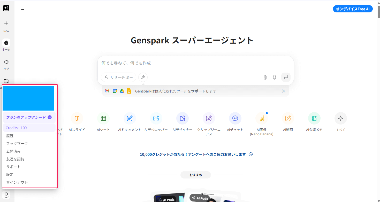左のバーの一番下を選んだ際に、自分のアカウント情報やクレジットが表示されていれば、すぐにGensparkを利用することができます。料金プラン変更などもここで行えます。