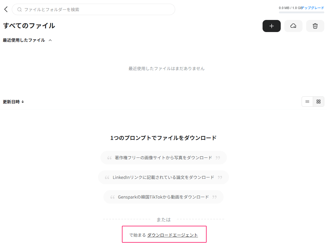 Gensparkはこの時点でAIエージェント機能も有効になっており、すぐにファイル収集や要約タスクを試すことができます。