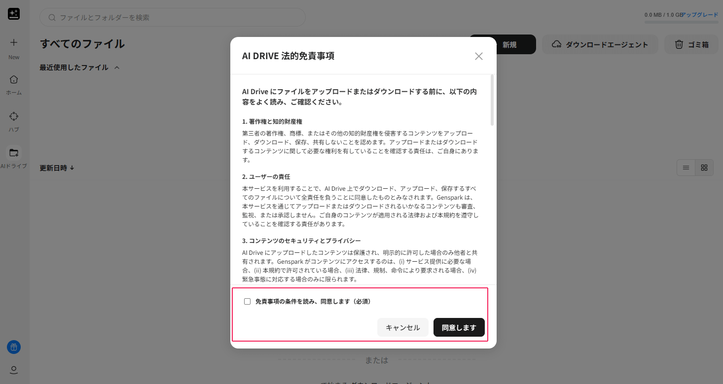 免責事項に同意することで、AIドライブの利用を始められます。