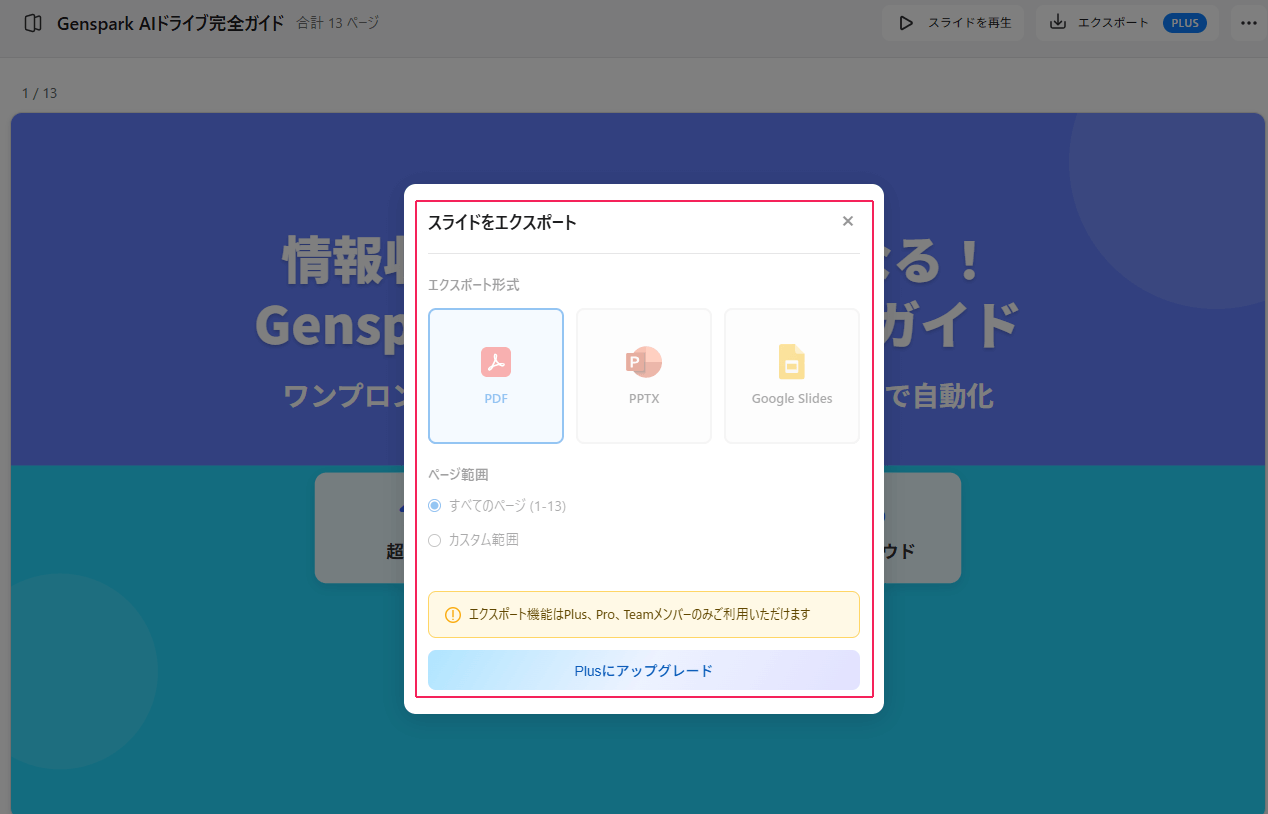 スライドを作成する際、無料プランではエクスポートできず、Plusプラン以上でダウンロード可能となることに注意してください。