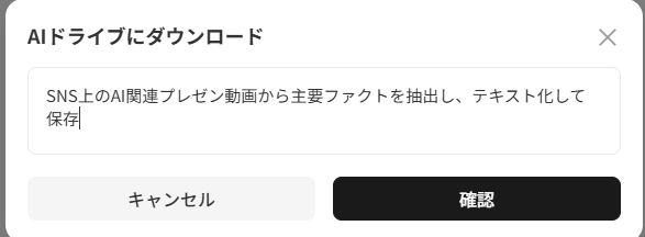指定した条件をもとに、Web上の資料を自動で検索→ダウンロード→AIドライブに整理保存します。ユーザーは一つの指示を入力するだけで、収集から要約までの一連のフローが完結します。