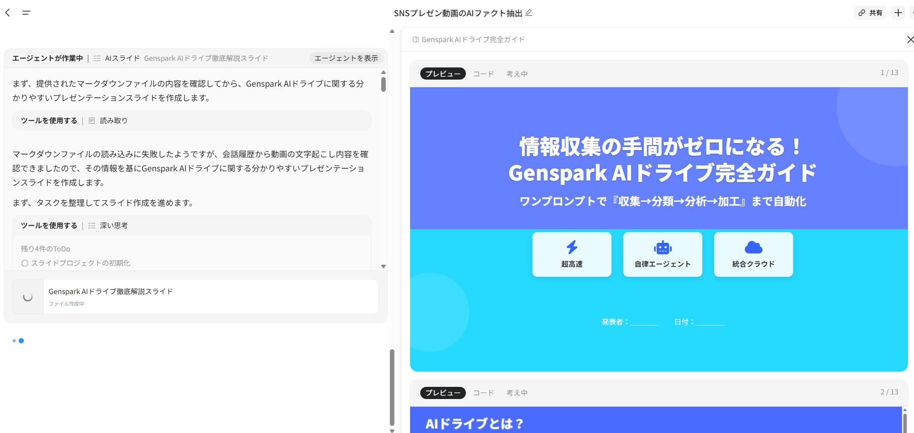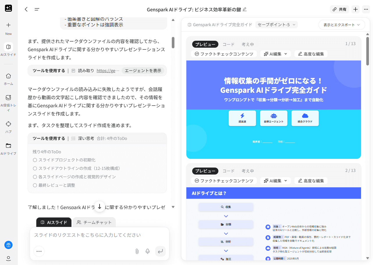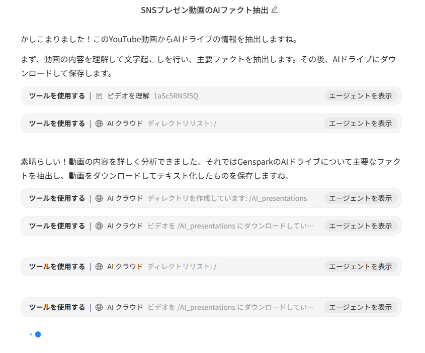 こうした生成エージェントによる対話的ワークフローこそが、Genspark AIドライブの真価です。