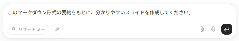 今回は要約化まで上の例で1件行っているので、この要約をスライド化する指示を出してみます。
