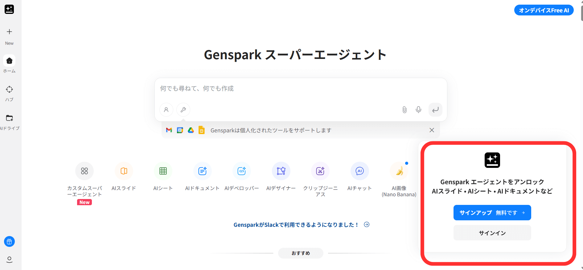 Gensparkの無料プランでは、アカウント登録するだけで基本的な機能をすぐに利用開始できます。