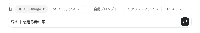 今回は生成モデルを「GPT Image」、画像スタイルを「リアリスティック」、画像サイズを「4:3」に設定し、「森の中を走る赤い車」とプロンプトを入力しました。