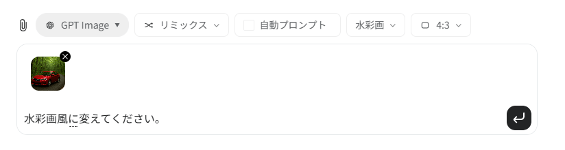 生成された赤い車の写真を、水彩画風に変更してみます。