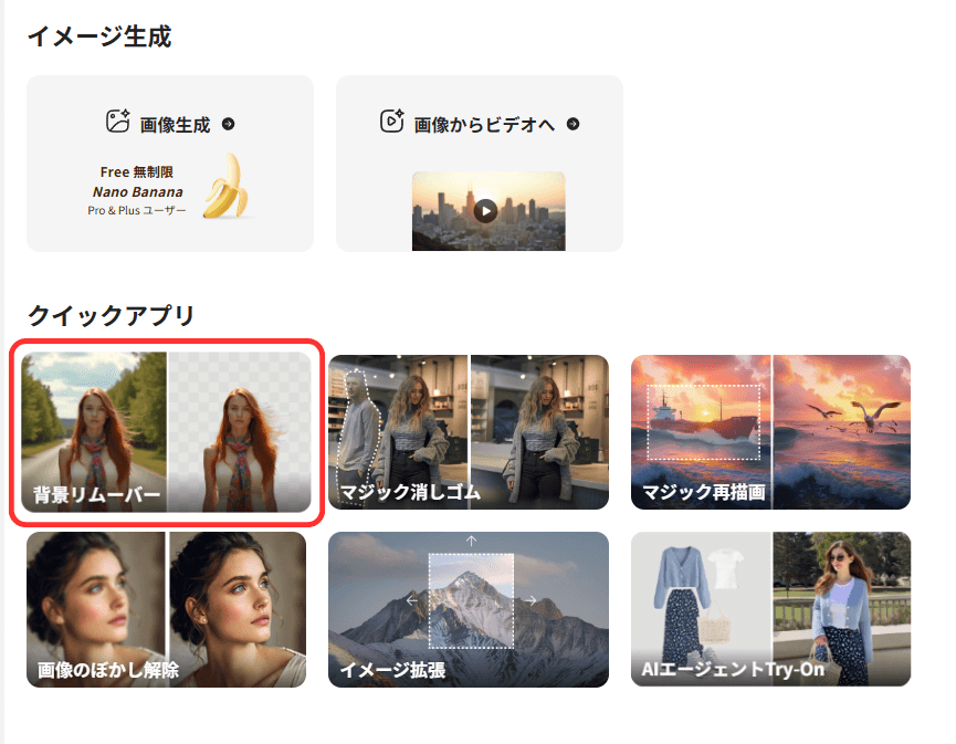 イメージスタジオのトップ画面に戻り、「背景リムーバー」を選択したら、保存した先ほどの画像を添付して背景除去をクリックします。