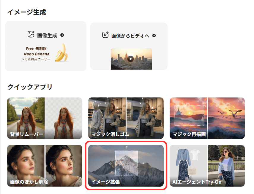 「イメージ拡張」を選択し、画像を添付したら拡張したい範囲をドラッグで指定して拡張ボタンを押します。