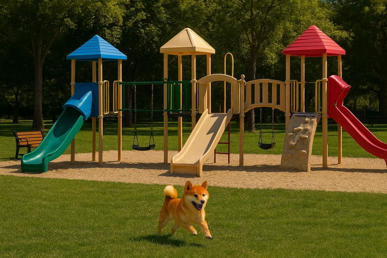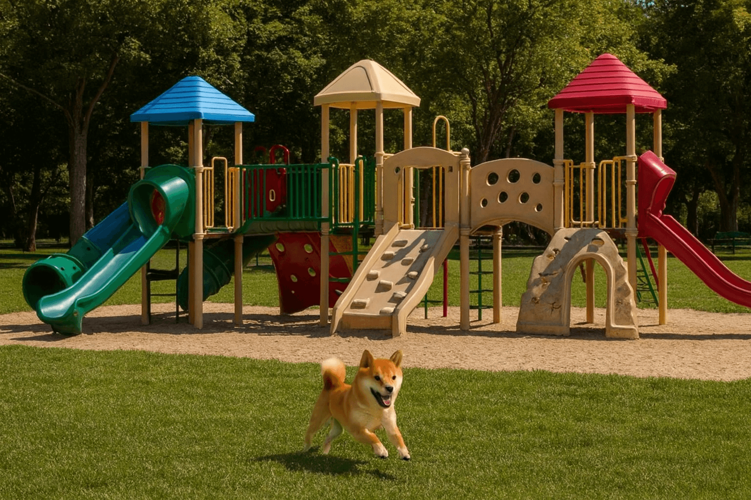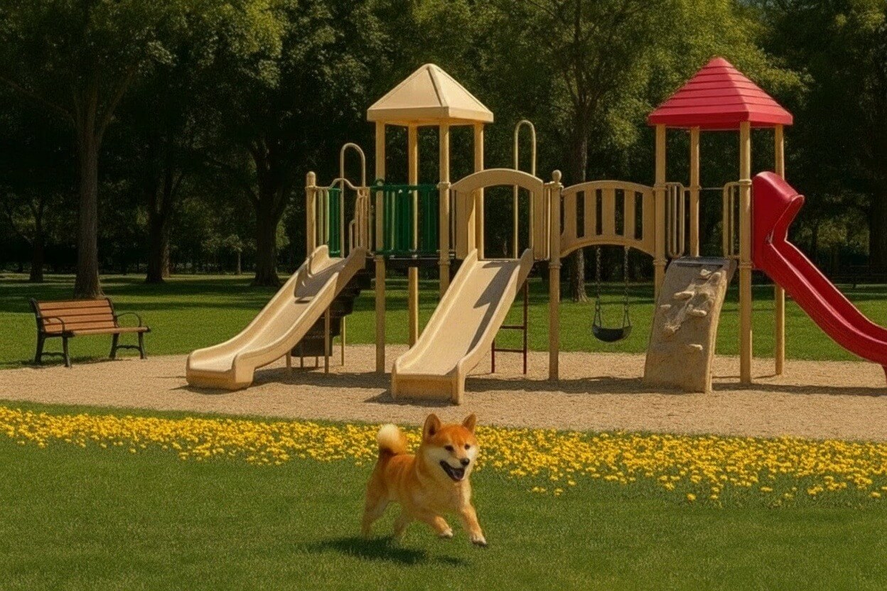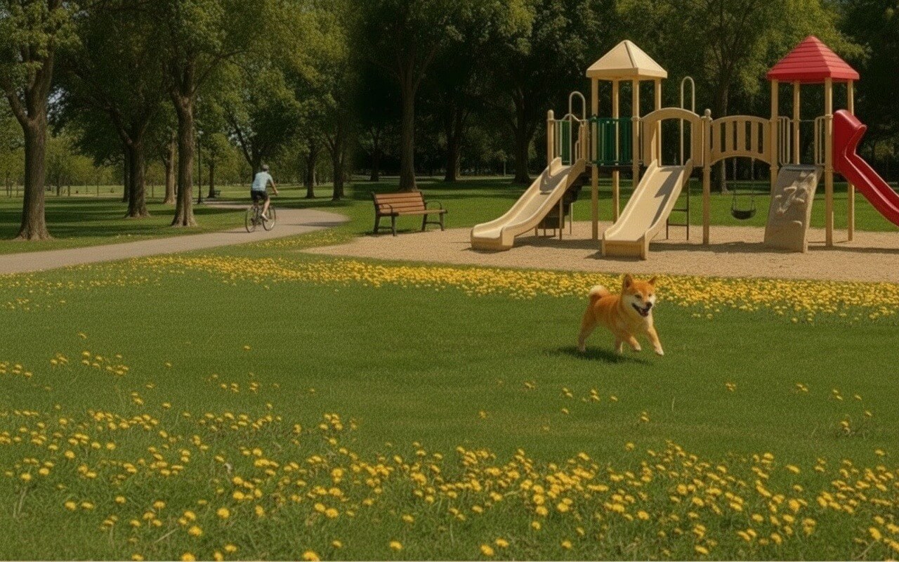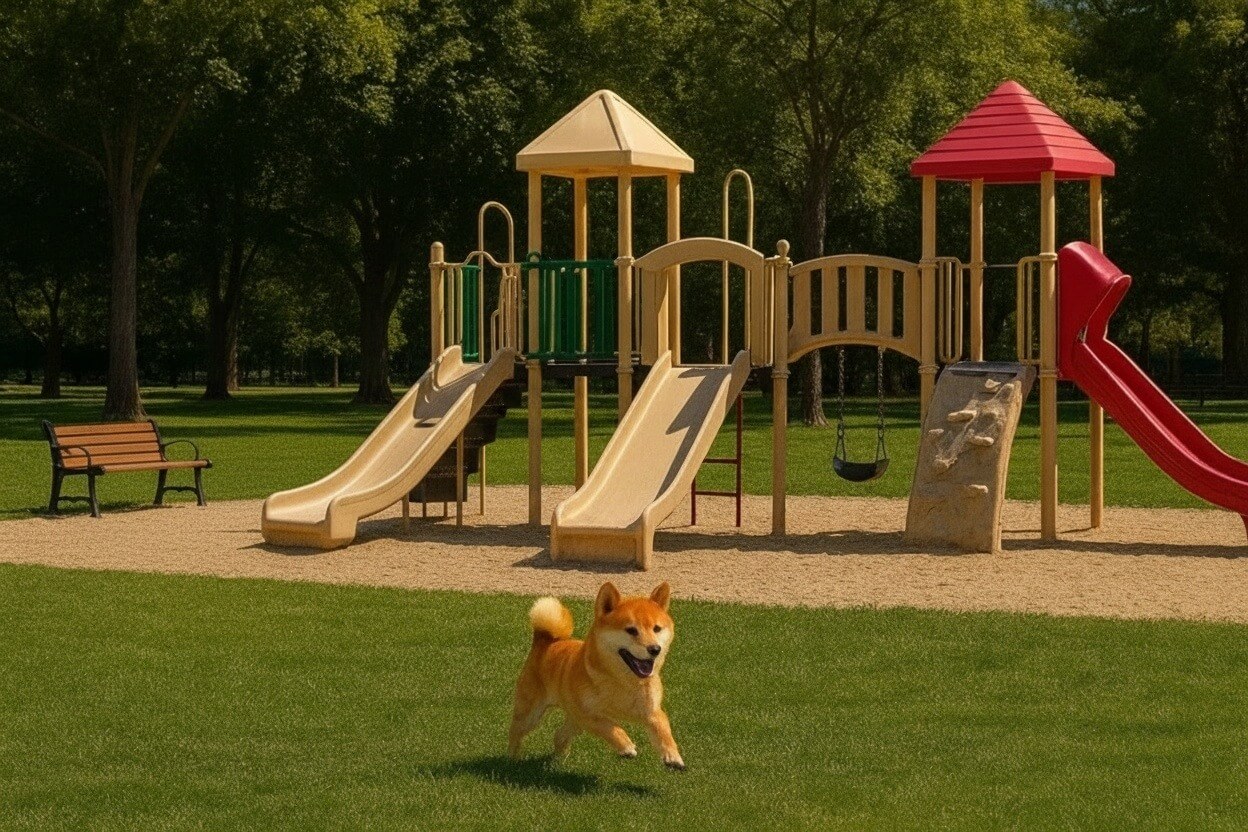 プロンプト「遊具が複数ある公園の画像に添付の犬を合成して。犬のサイズは画像全体の10分の1にして。」