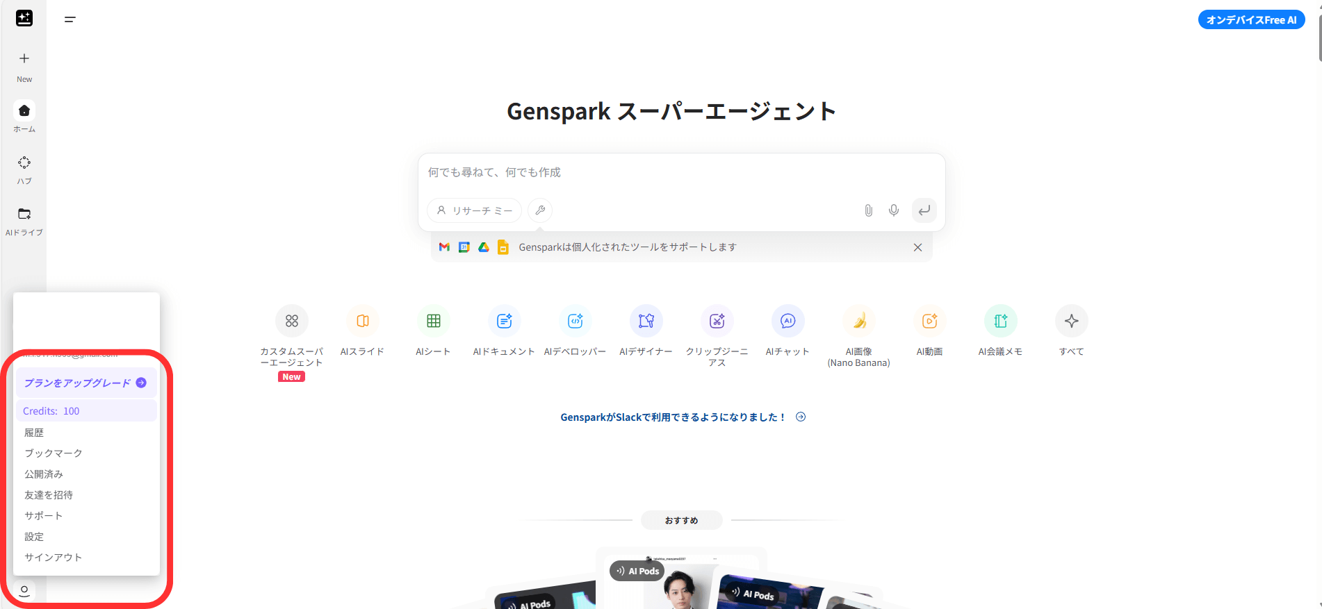 無料プラン登録時点で1日あたり100クレジットが付与されており、この範囲内であれば画像生成や編集機能を含むGensparkの各種AI機能を試すことができます。