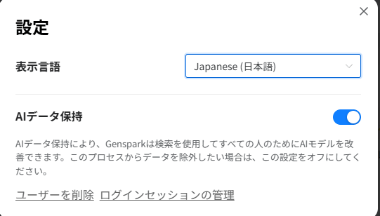 初回ログイン時にはチュートリアルや利用設定画面が表示され、表示言語を日本語に設定したり、AIデータ保持オプションを切り替えたりすることができます。