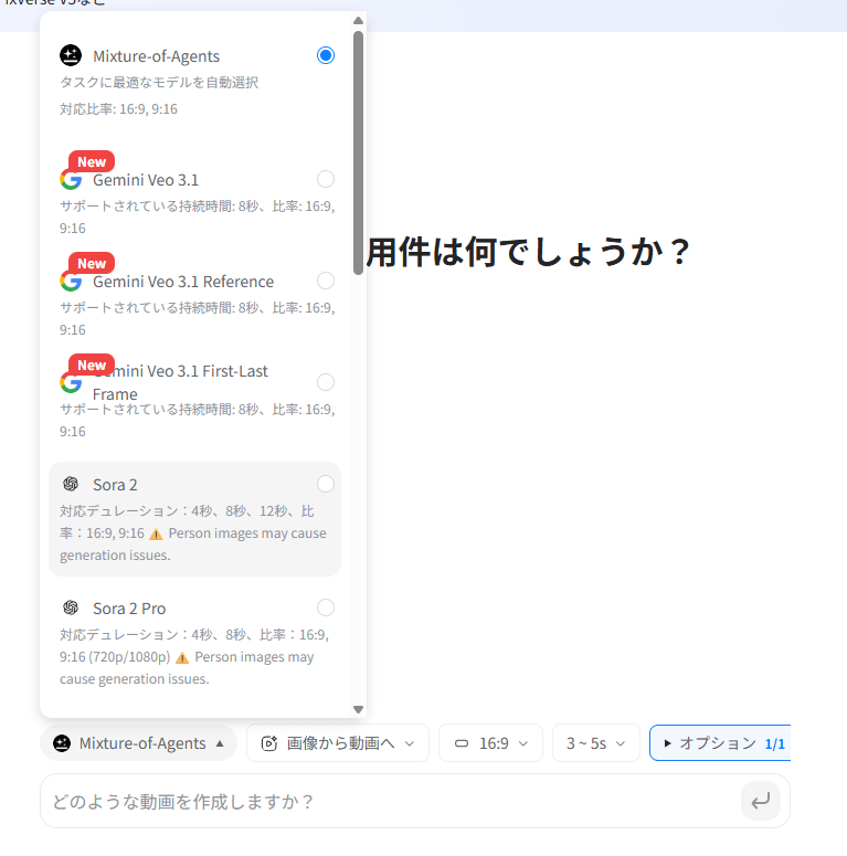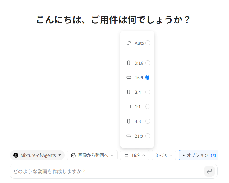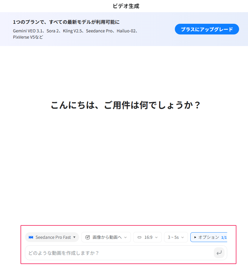 ※画像から生成する場合は、この画面の「画像から動画へ」から参照画像を追加するだけで、操作は同じです。