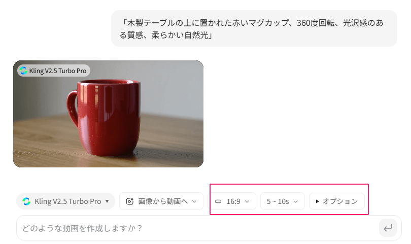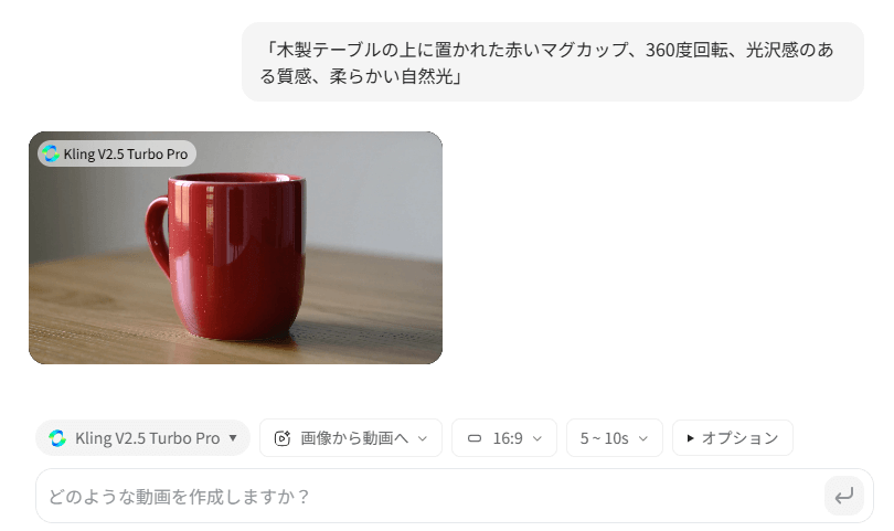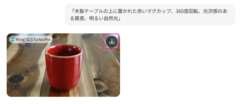 今回はプロンプトとして木製テーブルの上に置かれた赤いマグカップ、360度回転、光沢感のある質感、柔らかい自然光を指定しました。