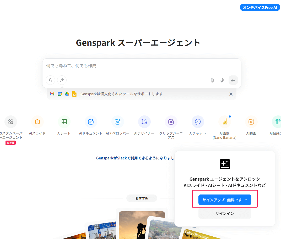 Gensparkの公式サイトへアクセスします。「サインアップ」を選ぶと、メールアドレス登録かSNSアカウントによるアカウント作成が可能です。