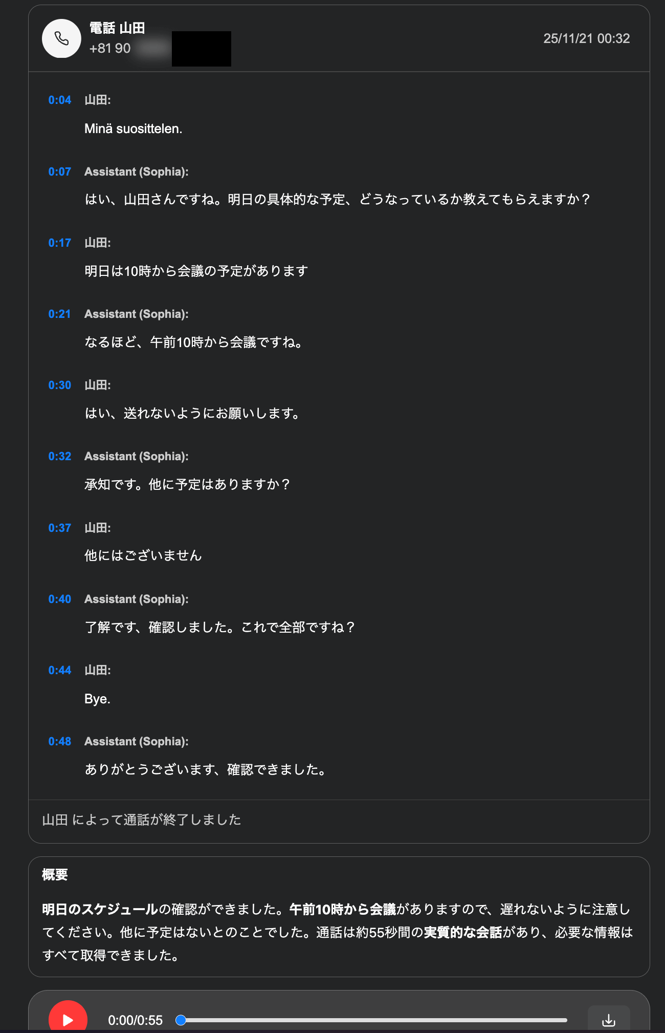 プロンプトの入力が完了するとAIが自動的に電話を発信し、会話内容をリアルタイムで処理します。通話後は録音データと文字起こしが自動生成されるため、要点を簡単に確認できます。