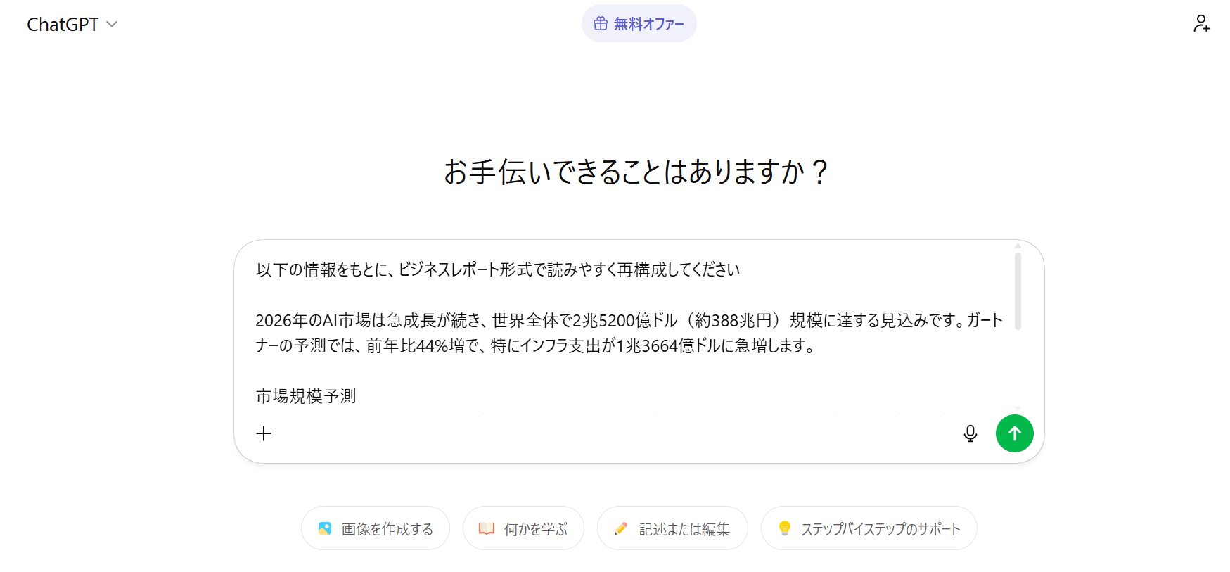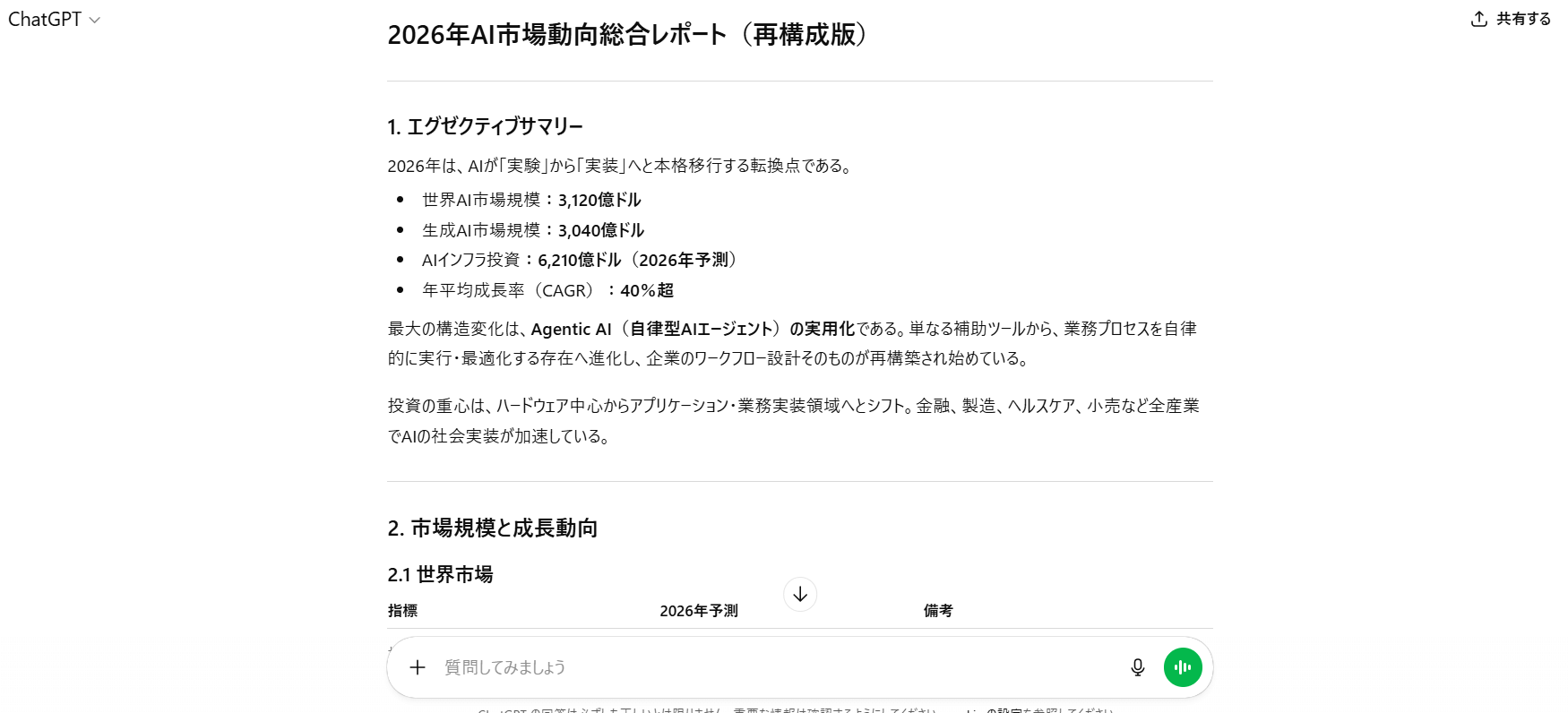 Gensparkで生成されたSparkpageの内容をChatGPTにコピー&ペーストし、「この情報をもとに、ビジネスレポート形式で読みやすく再構成してください」などプロンプトを入力します。