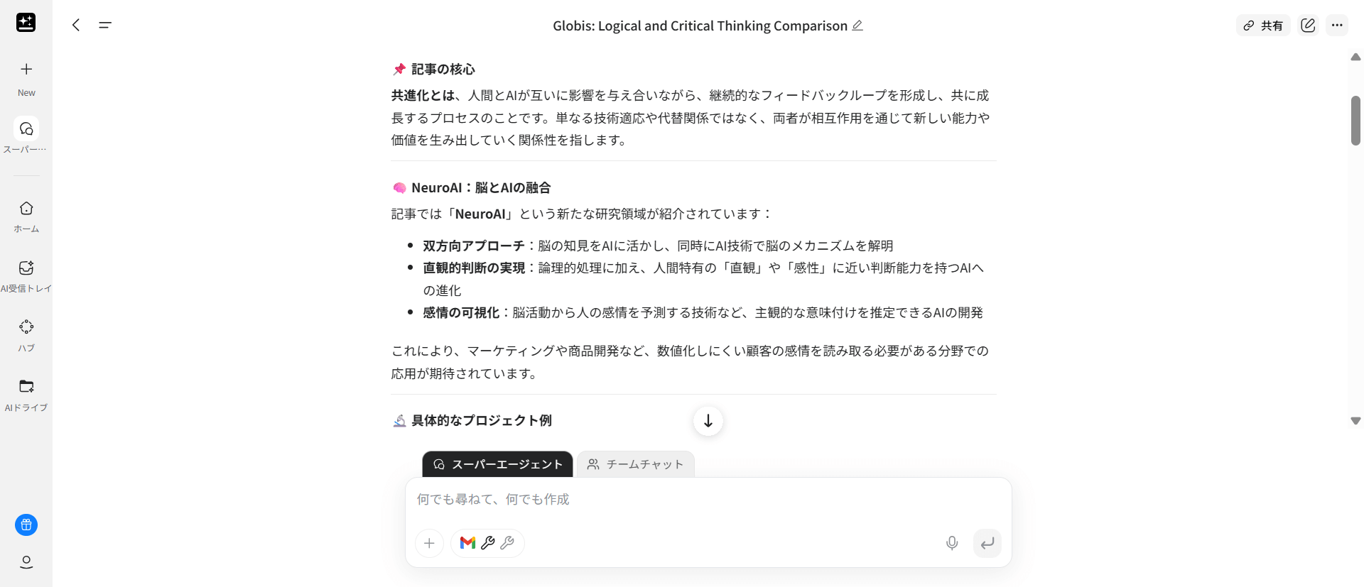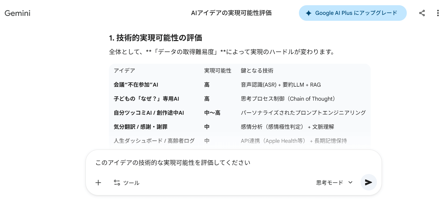 Geminiは、Google検索を通じて最新の技術動向や類似事例を参照しながら、現実的な視点で評価してくれます。アイデアの実現に必要な具体的なステップや課題を、明確にしてくれます。