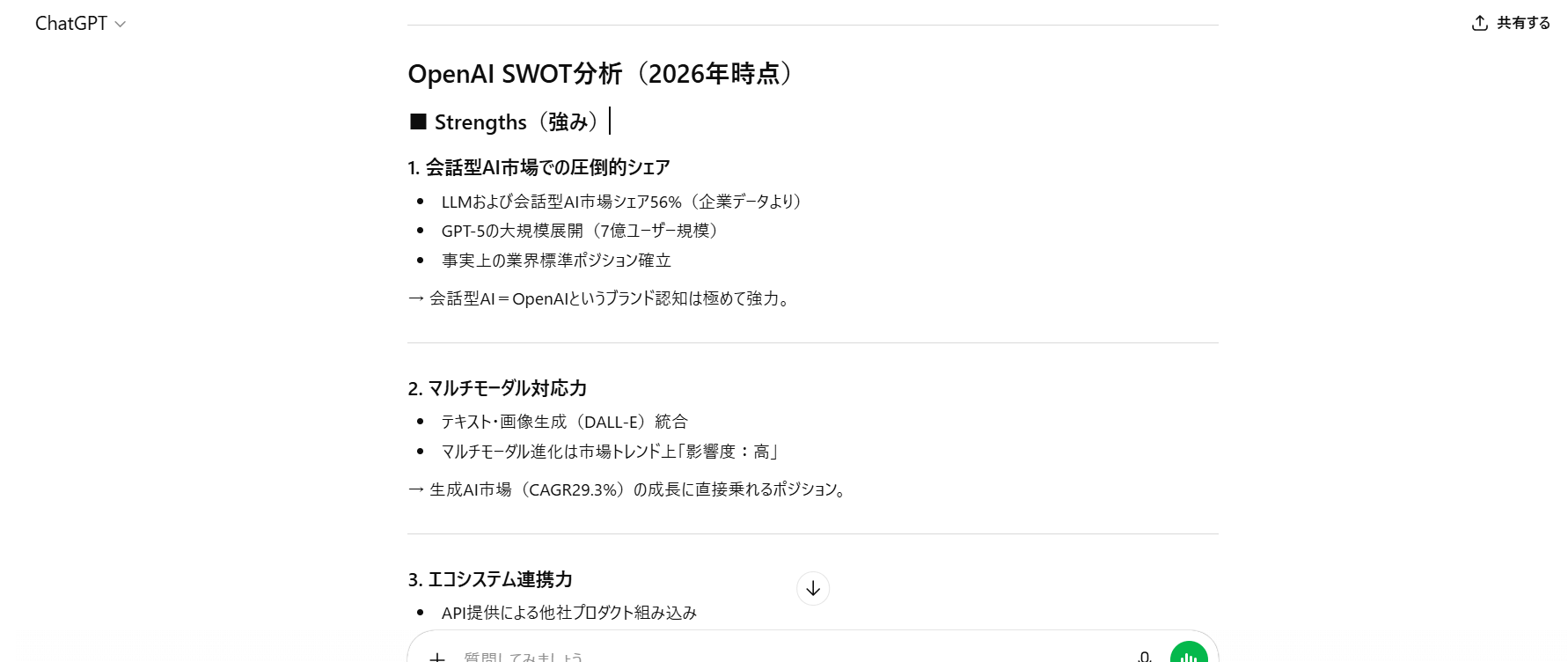そのデータをもとにChatGPTへSWOT分析や具体的な施策の提案を依頼することで、高度な推論に基づいた説得力のある戦略を短時間で練り上げることができます。