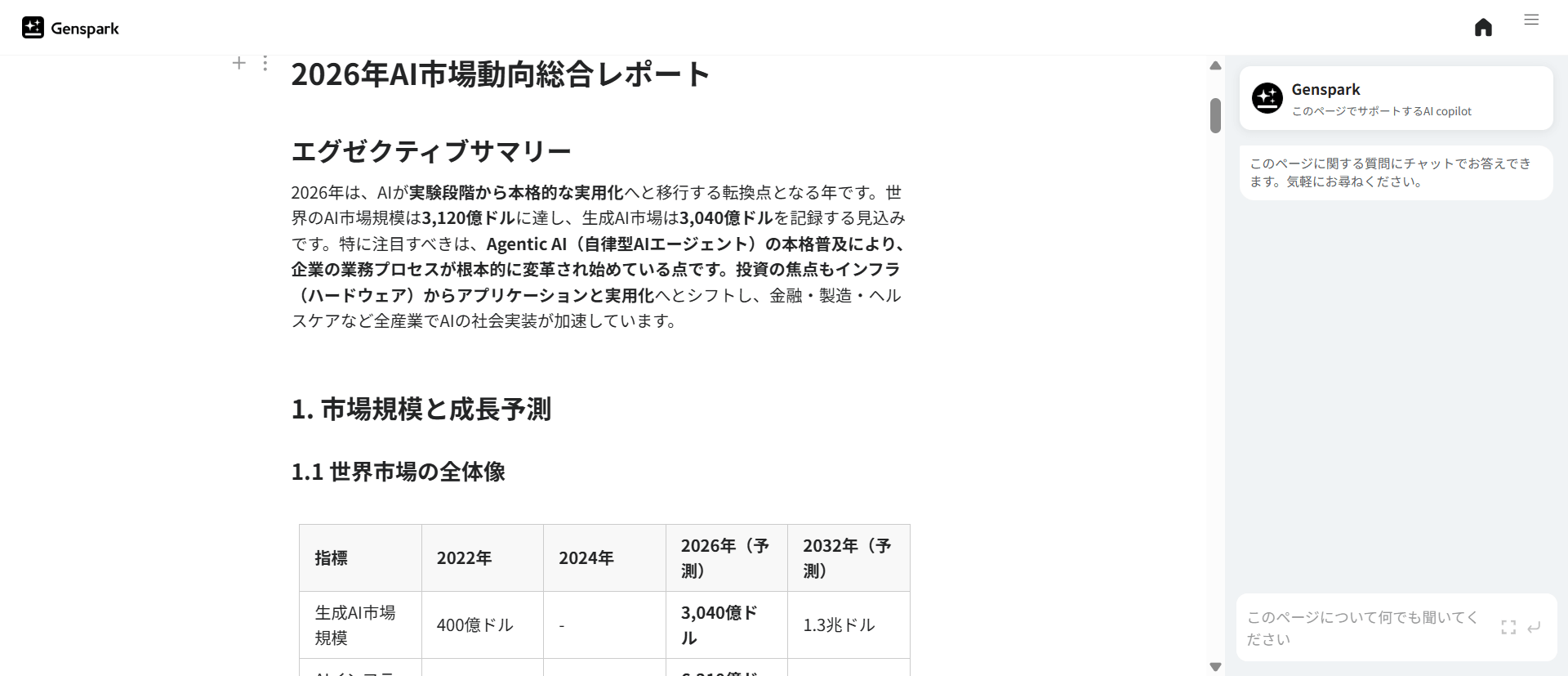 GensparkのDeep Researchを使って、調査したいテーマに関する情報を網羅的に収集しましょう。たとえばチャット欄に「2026年のAI市場動向」と入力します。