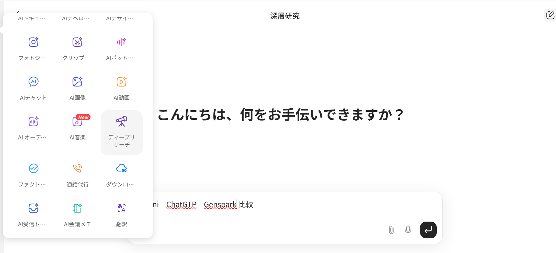 Gensparkは、情報収集・リサーチにおいて圧倒的な強みを持っています。「Deep Research」機能を使えば、入力したキーワードを深く掘り下げ、関連情報を網羅的に収集し、要約や図表付きのレポートとして自動生成します。