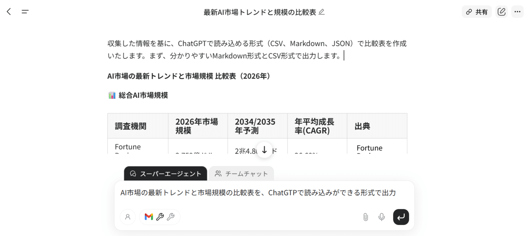 さらに「AIの最新トレンドと市場規模の比較表を、ChatGTPに読み込みができる形式で出力」と入力しました。