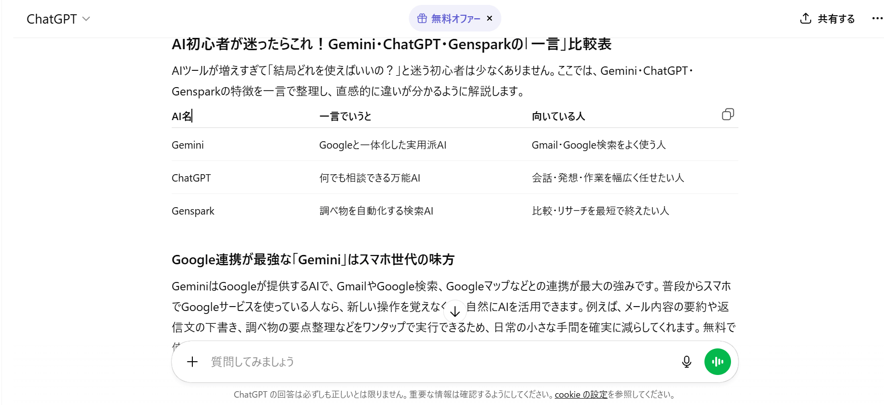 | 評価項目 | Genspark | ChatGPT | Gemini |