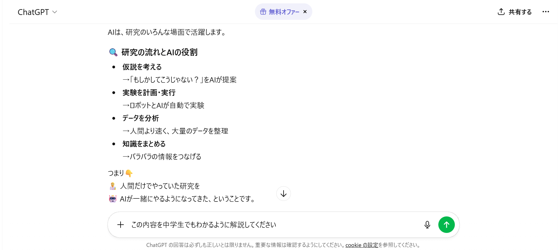 さらに、「この技術の実用化にはどんな課題は?」「競合技術と比較した強みは?」など、追加の質問を重ねることで、理解を深めることができます。ChatGPTは文脈を保持しながら対話を続けるため、まるで専門家と議論しているような学習体験が得られるでしょう。
