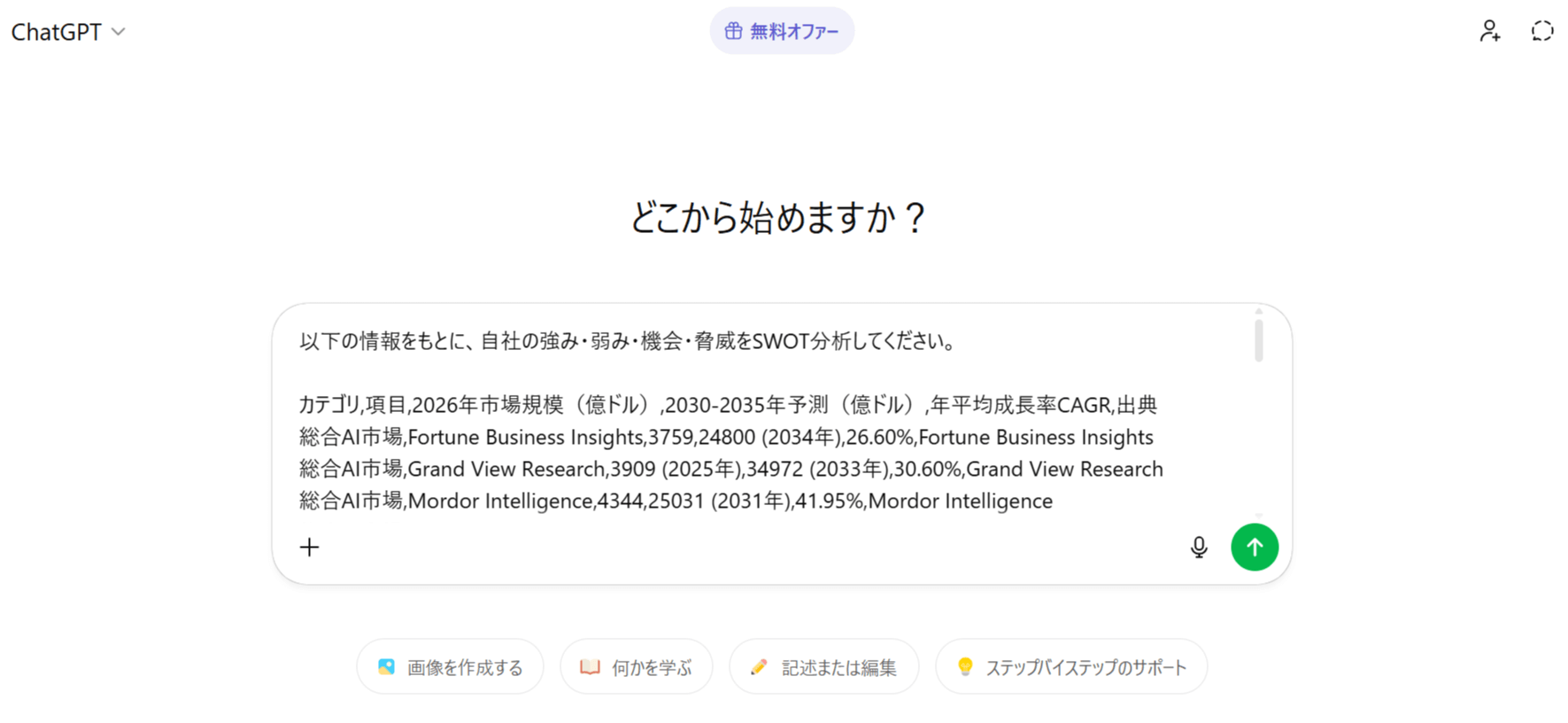 収集したデータと自社のデータをChatGPTに渡し、「この情報をもとに、自社の強み・弱み・機会・脅威をSWOT分析してください」とプロンプトを入力します。