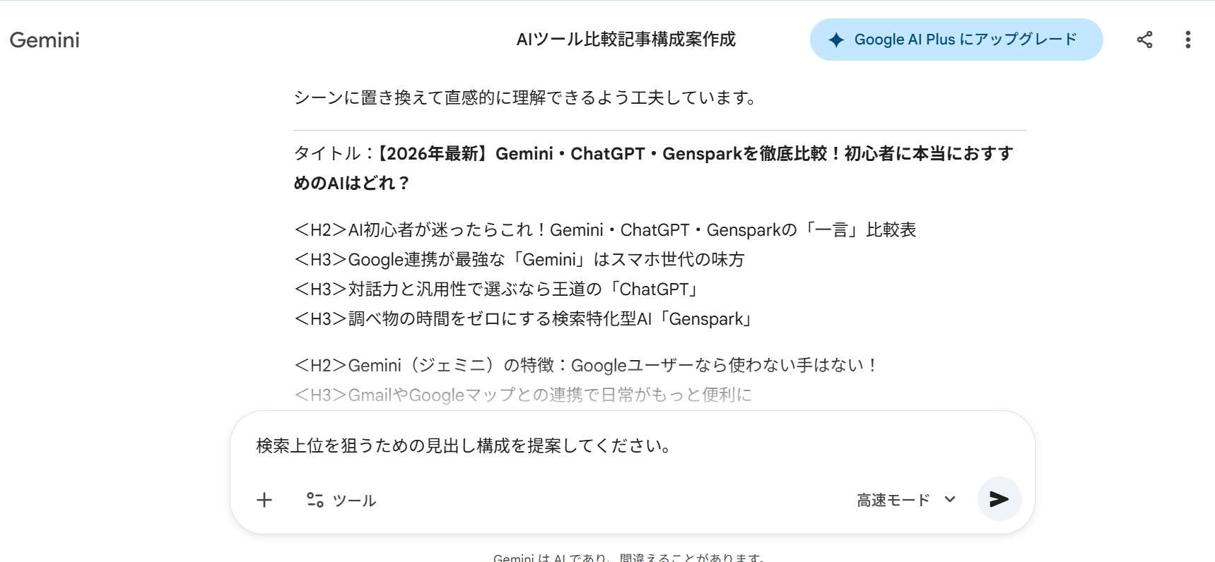 Geminiは検索結果との整合性を考慮した提案をするため、実際にユーザーが求めている情報を的確に押さえた構成になります。
