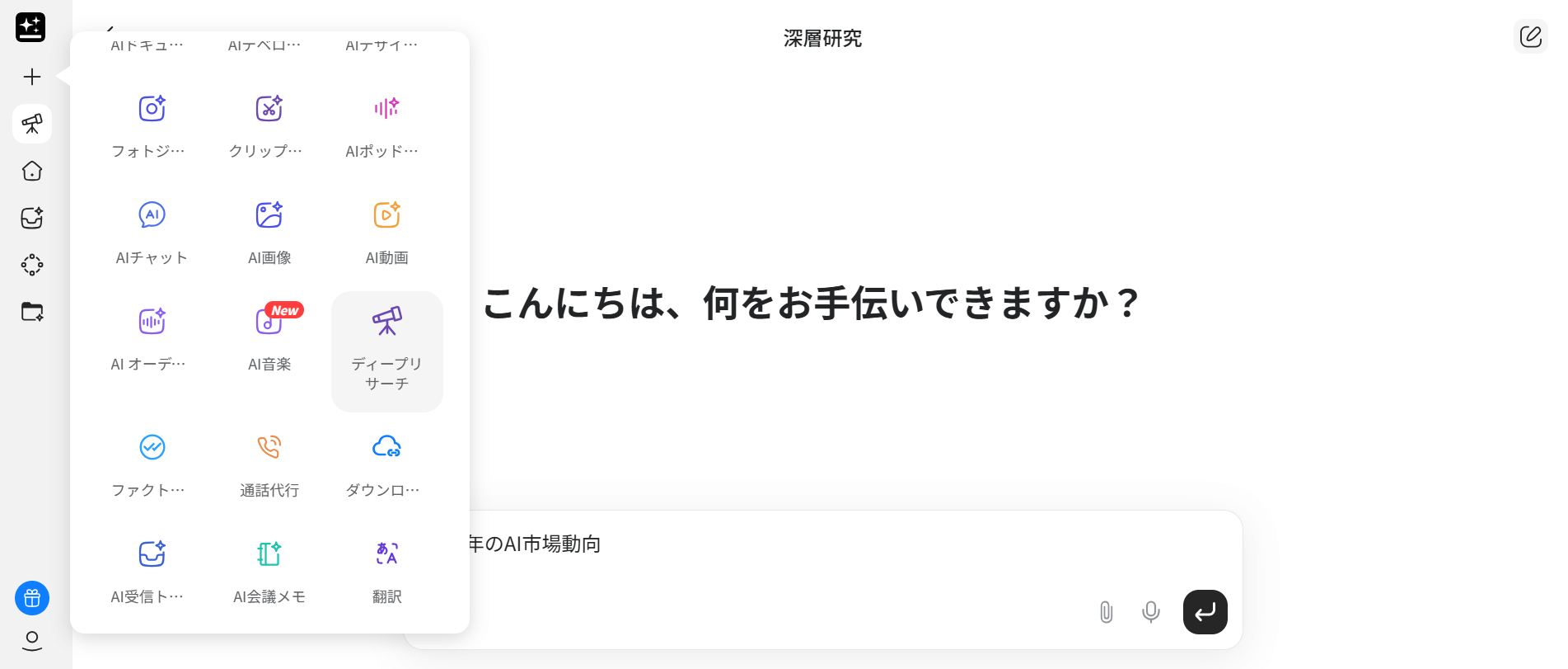 スライド作成やデータ分析、画像生成、動画生成といった多彩な機能も統合されています。情報収集から資料作成までをワンストップで完結できる多機能型ツールとして、注目を集めています。