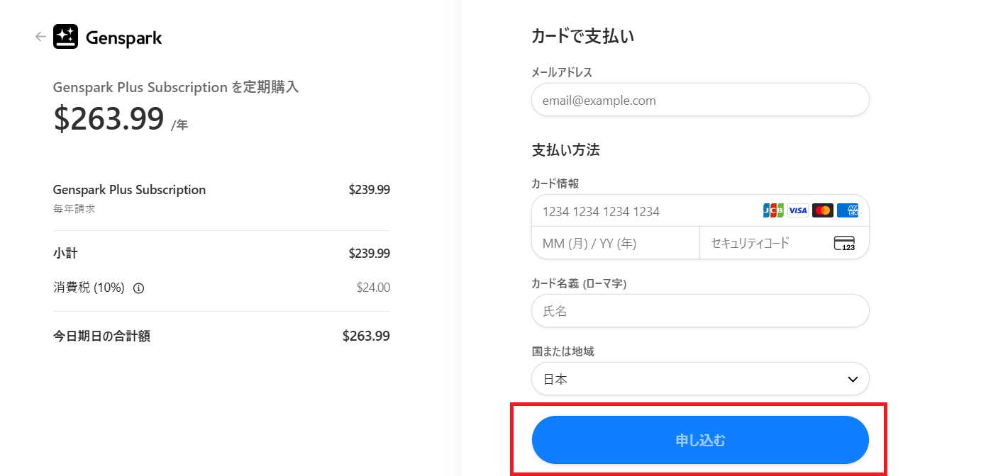 クレジットカード情報を打ち込み、「申し込む」ボタンをタップする。