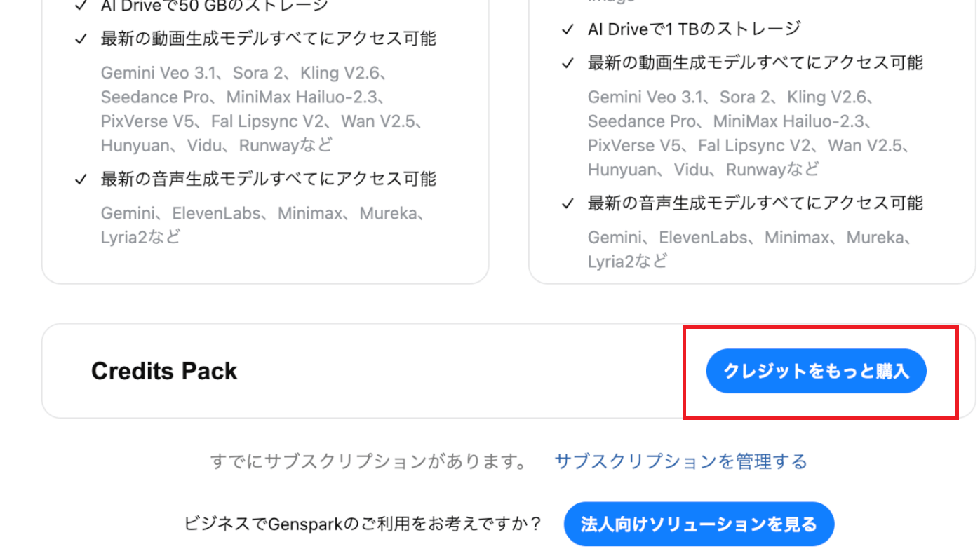 クレジットを使いきってしまった時のために、Gensparkにはプランのアップグレード以外に、クレジットを追加購入する機能が用意されています