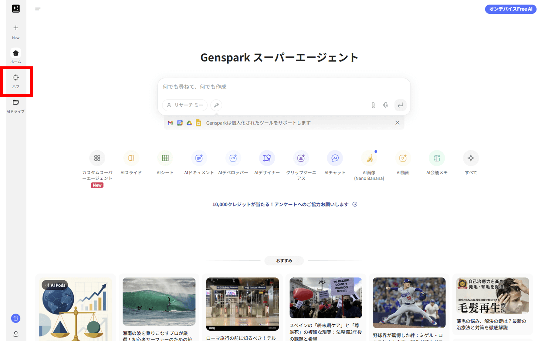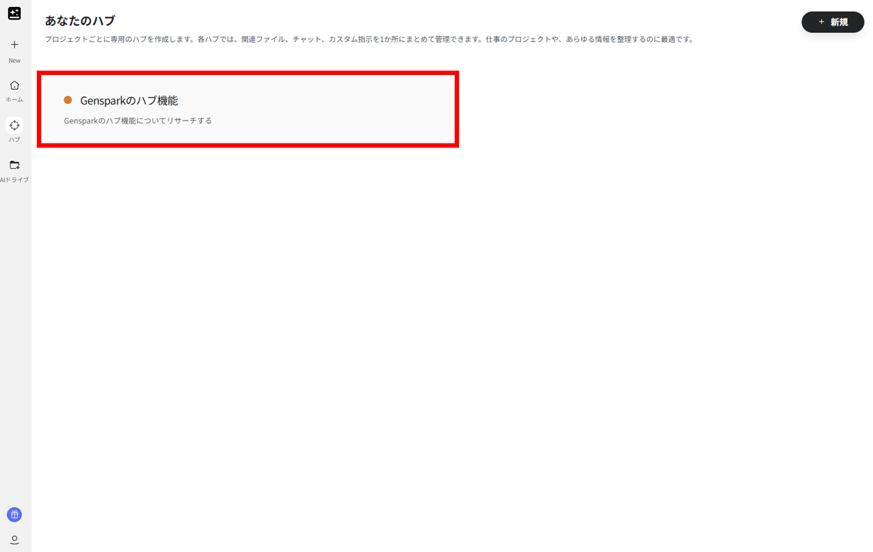 Gensparkのサイトにアクセスし、左側のメニューから「ハブ」を選択してください。