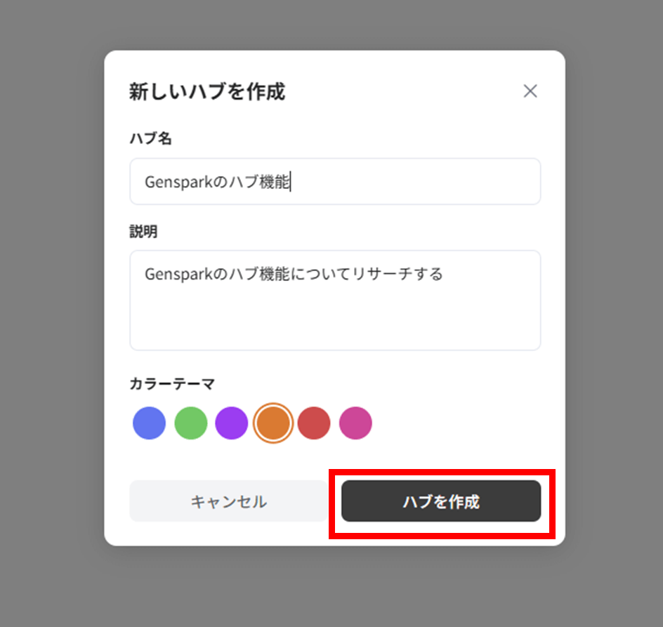 「新しいハブを作成」のウィンドウが表示されますので、ハブ名と説明を入力し、必要に応じてカラーテーマを選択したら、「ハブを作成」をクリックしましょう。