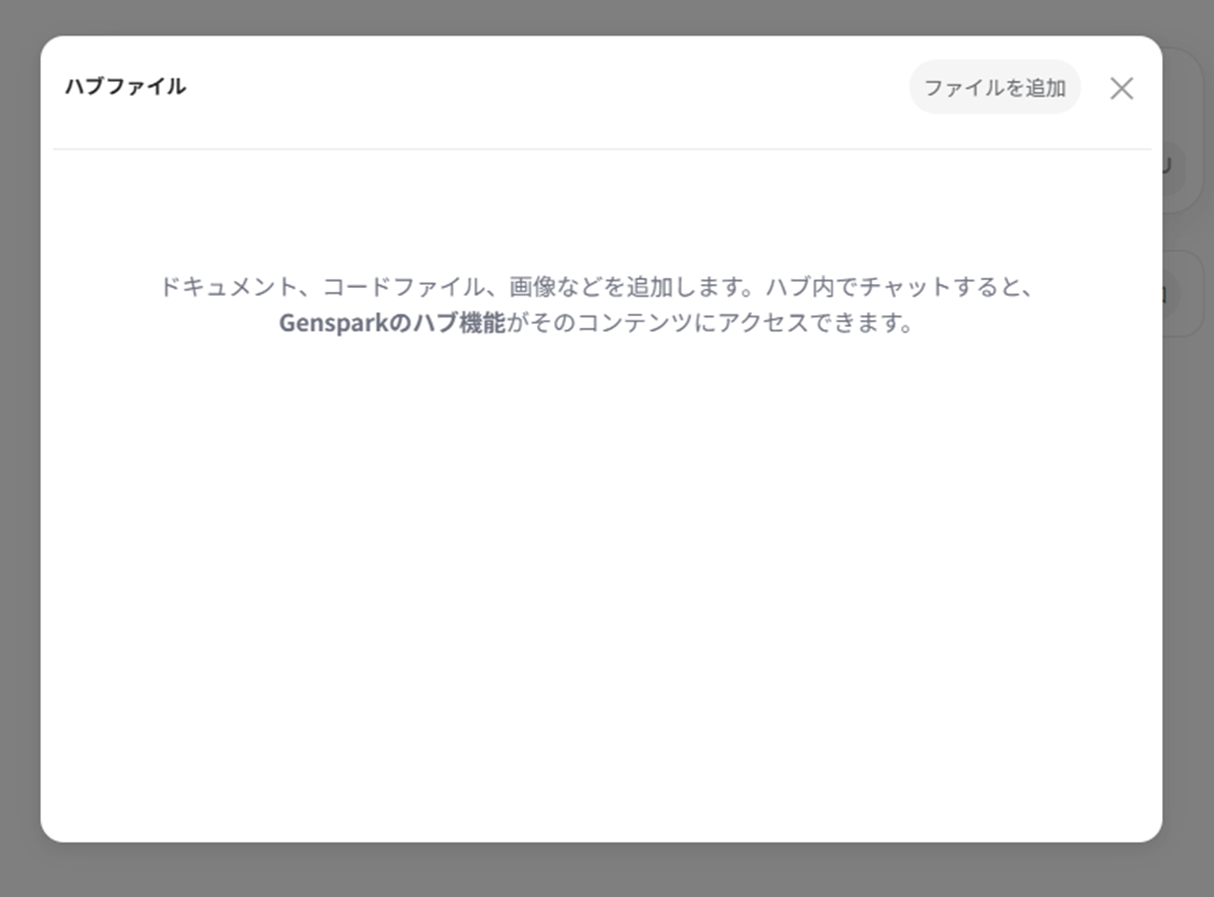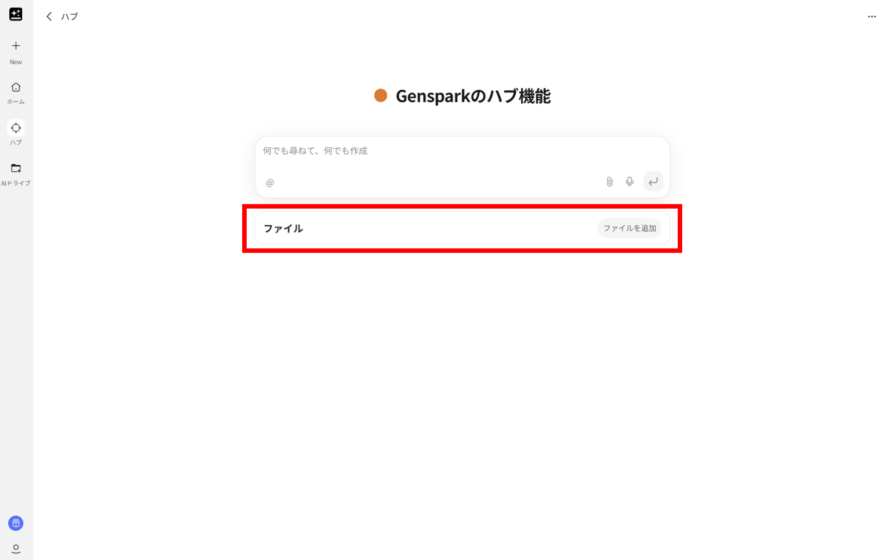 ハブ内でGensparkが常に参照することができるようにファイルを追加できます。方法は簡単で、まずは「ファイル」の部分をクリックして下さい。